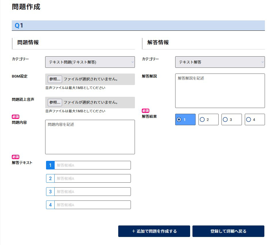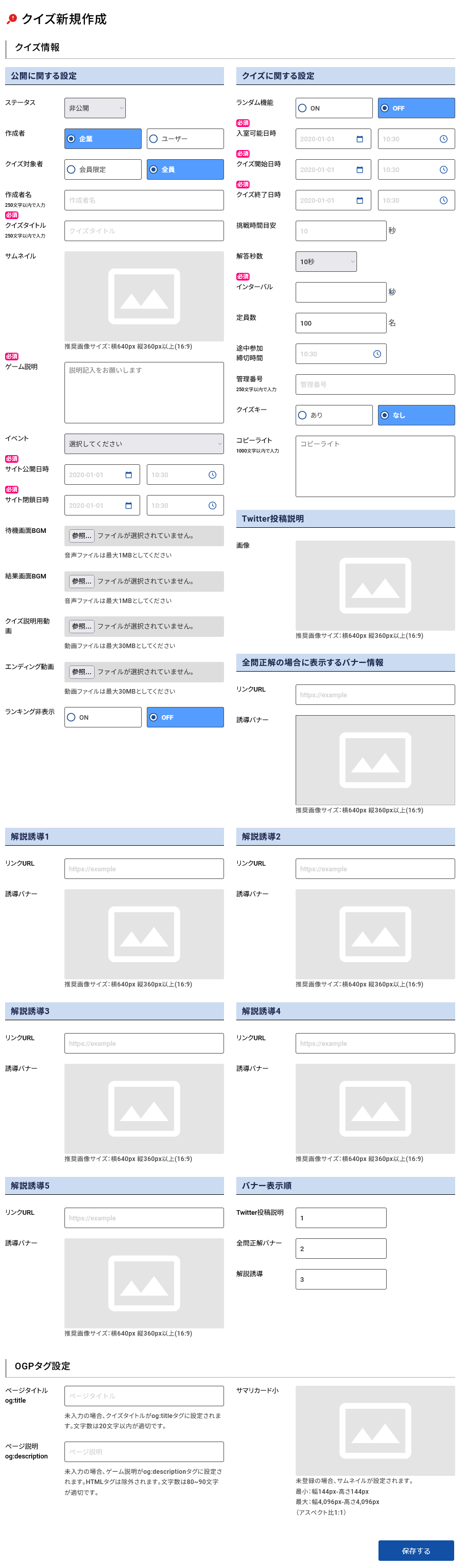 上記の画像が現れるので必須事項を入力してクイズの設定を登録します。