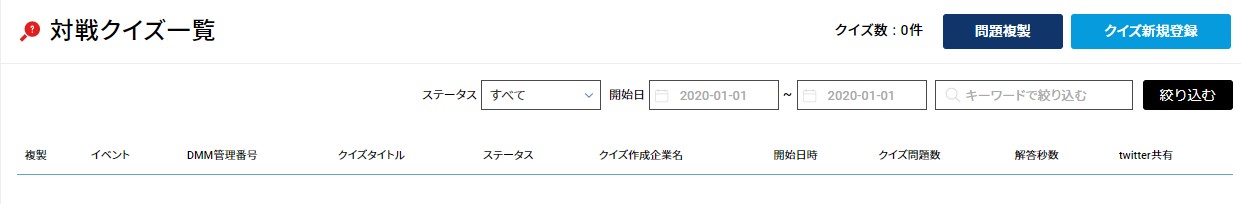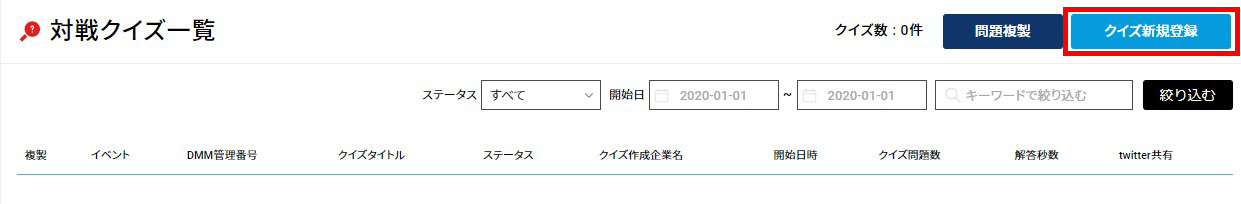 最初はクイズがないので右上の「クイズ新規作成」でクイズを作成します。