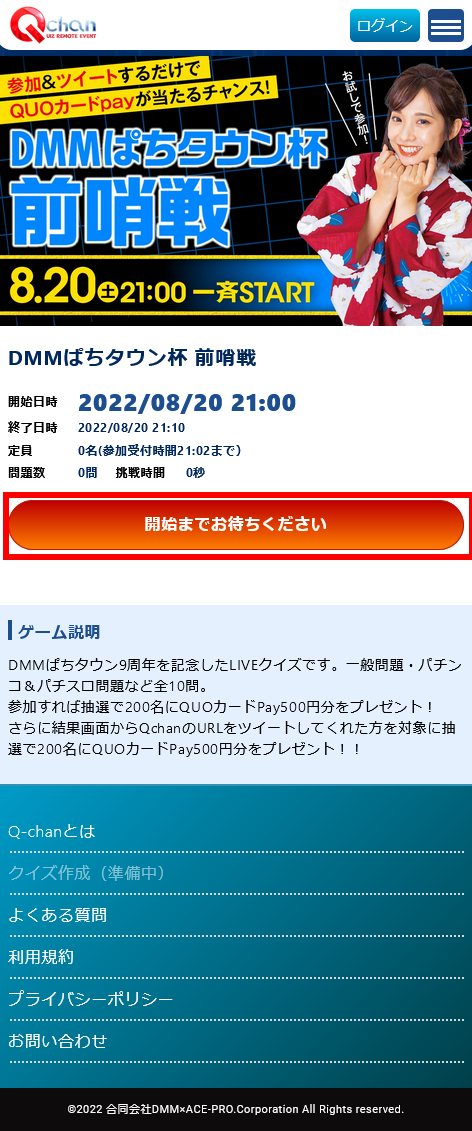 ユーザーには「入場」を押して待機画面でクイズが始まるまで待機していただきます。