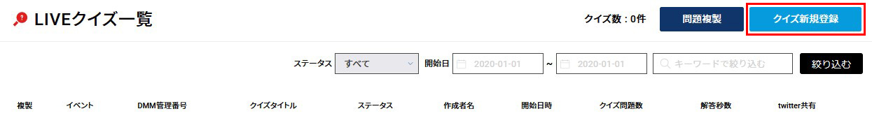 最初はクイズがないので右上の「クイズ新規作成」でクイズを作成します。
