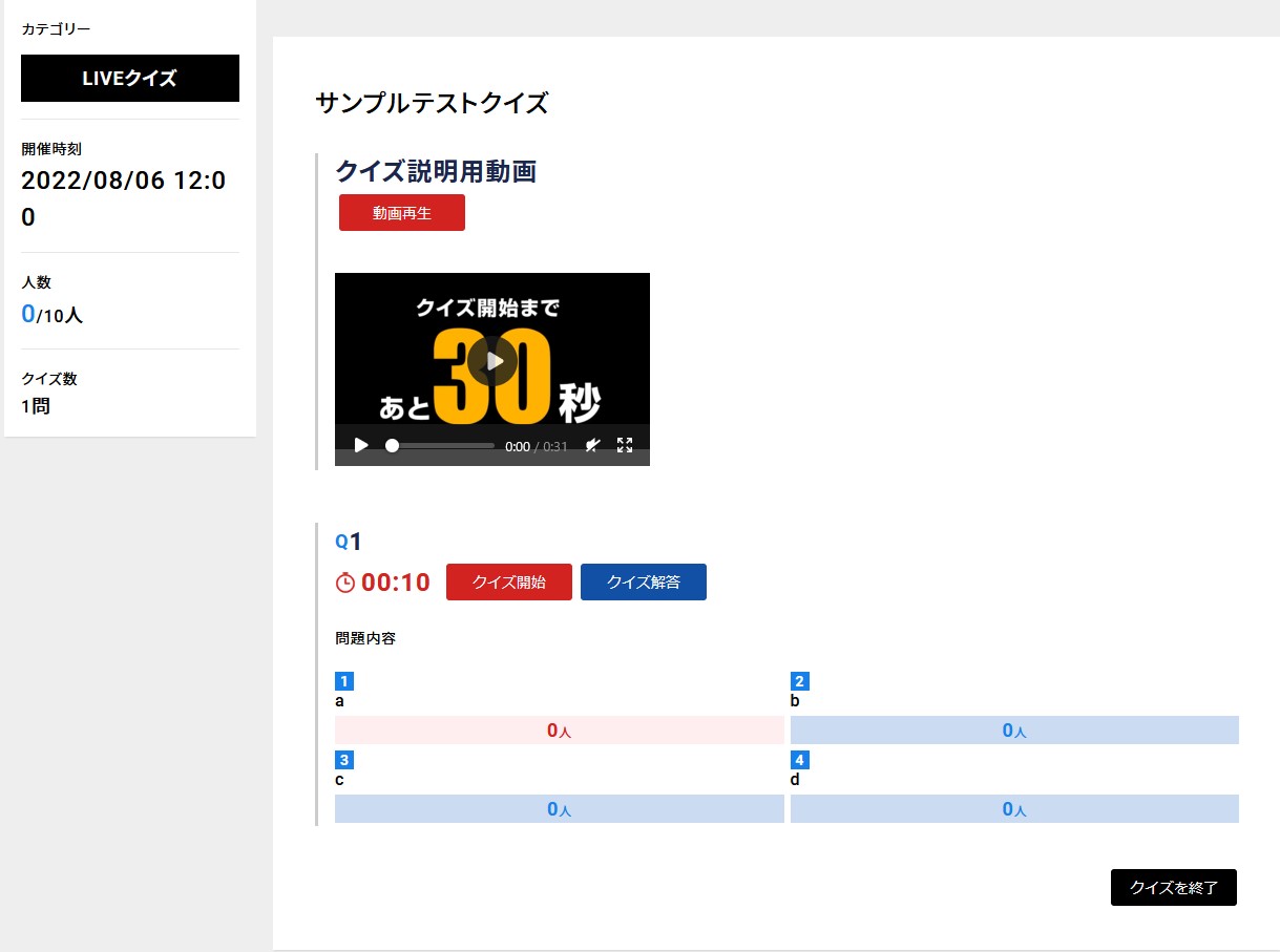 司会進行しつつ、開催時刻になったら「クイズ説明用動画」を押し(説明用動画がある場合)、再生が終わったらQ1の「クイズ開始」を押し、解答時間が終わったら「クイズ解答」を押します。