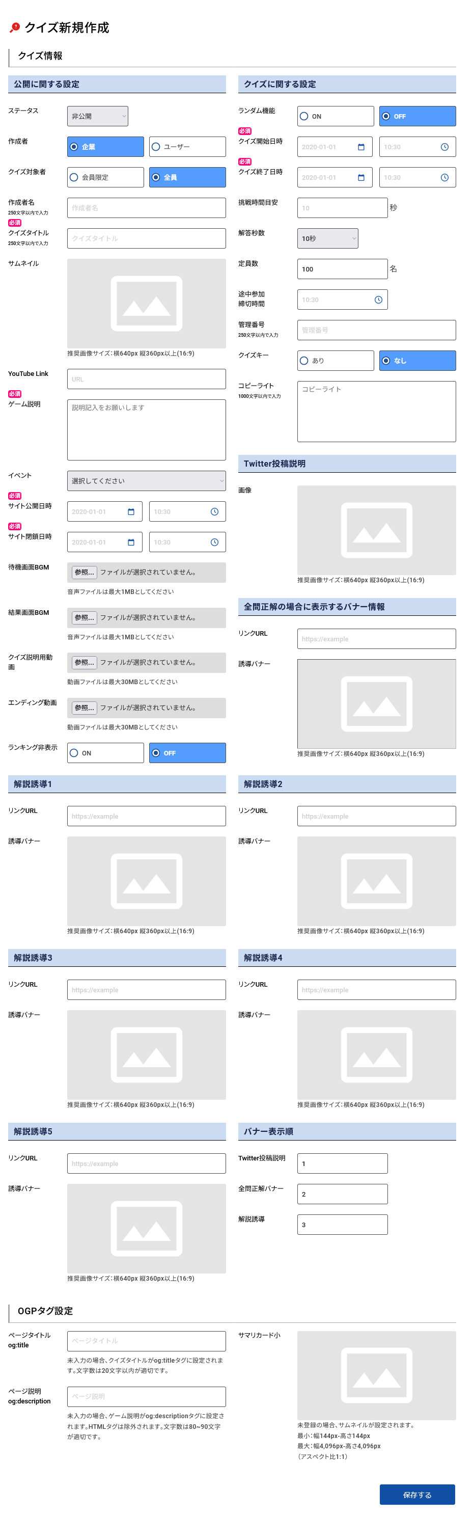 上記の画像が現れるので必須事項を入力してクイズの設定を登録します。